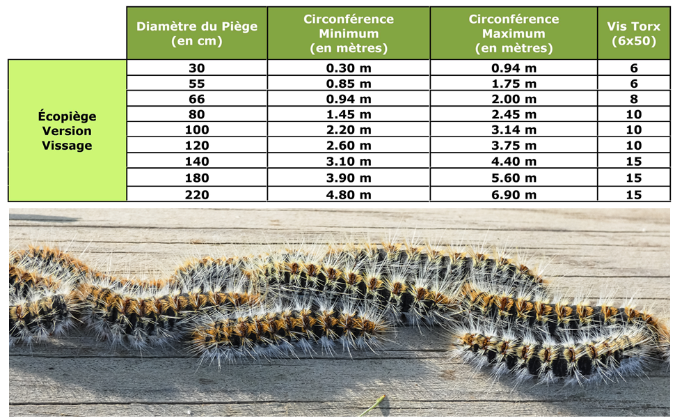 Les tailles très grandes, avec un diamètre de 120 cm et plus, sont généralement réservées aux très gros cèdres. Remarque importante : si l'Écopiège est trop grand, il est toujours possible de le découper pour l'ajuster parfaitement à la taille de votre arbre.
